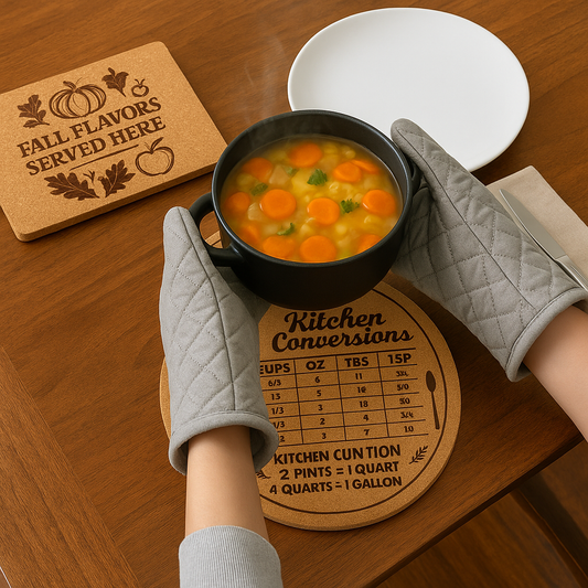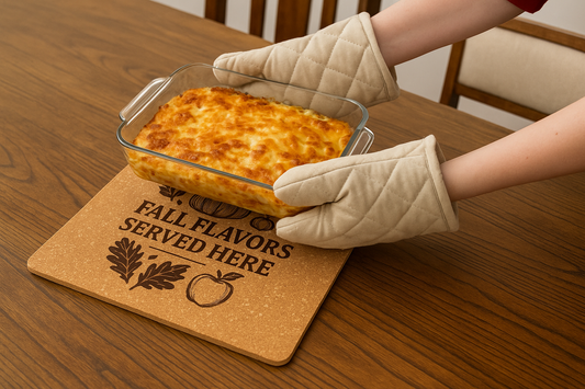 Fall Flavors Served Here Cork Trivet – Engraved Pot Mat for Autumn