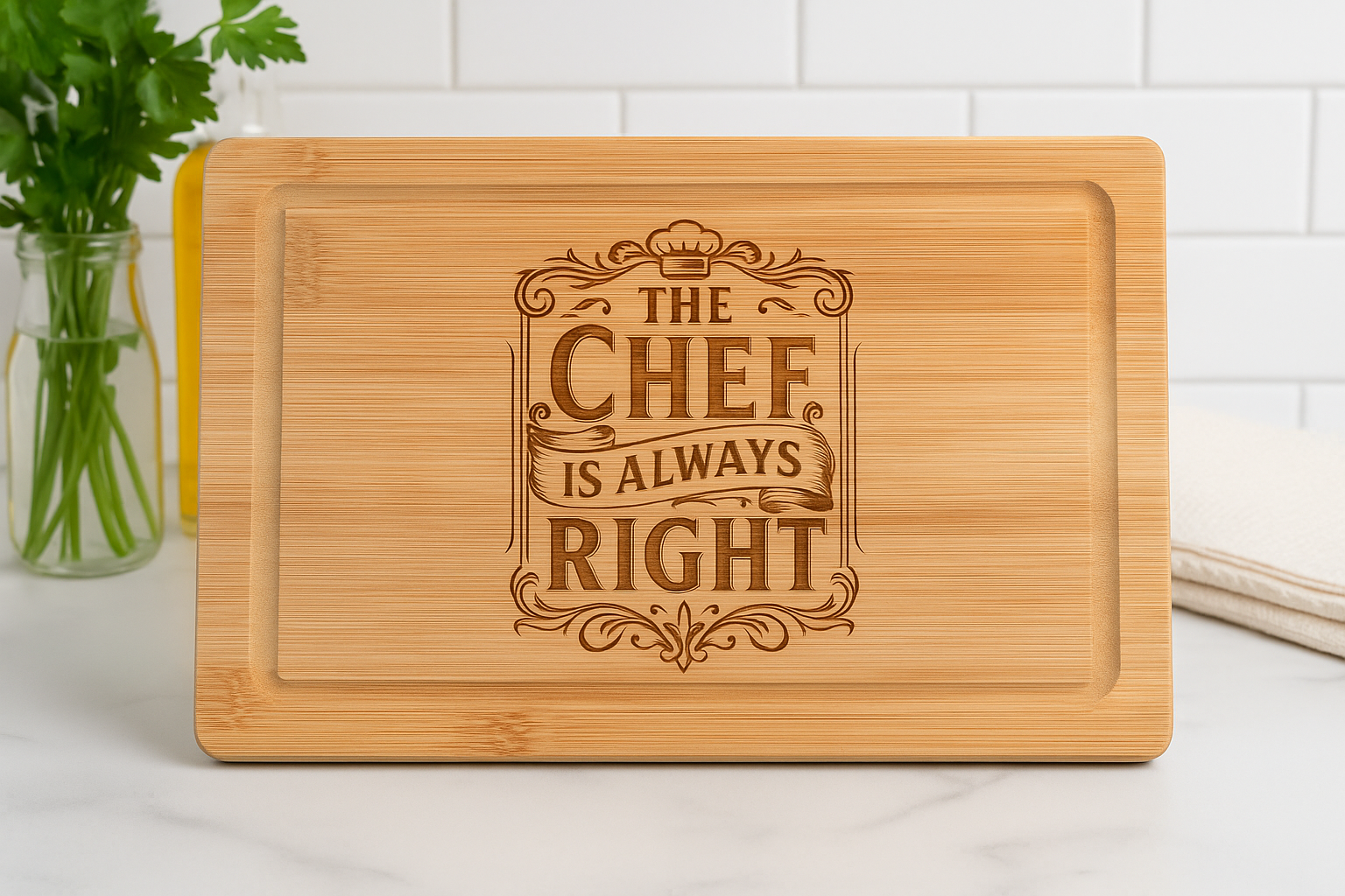 Engraving: “THE CHEF IS ALWAYS RIGHT” centered and laser-etched for lasting quality