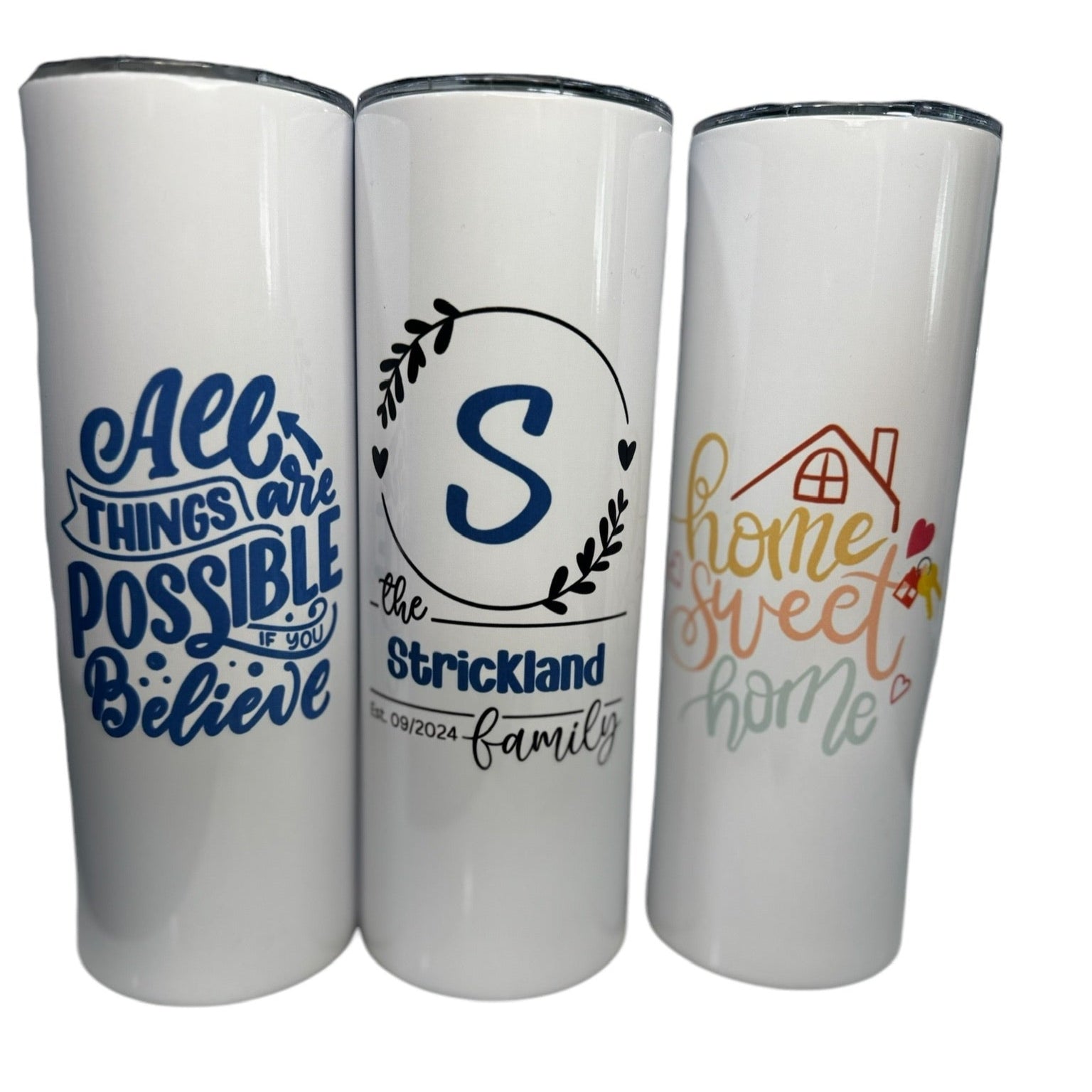 Stay stylish and hydrated with our Personalized Sublimated Skinny Tumbler 20oz. This sleek, double-walled tumbler is designed to keep your beverages at the perfect temperature while showcasing your unique custom design. Made for everyday use, it's perfect for on-the-go sipping. Whether it’s for yourself or a thoughtful gift, this white tumbler can be fully personalized through sublimation, ensuring vibrant, long-lasting designs.