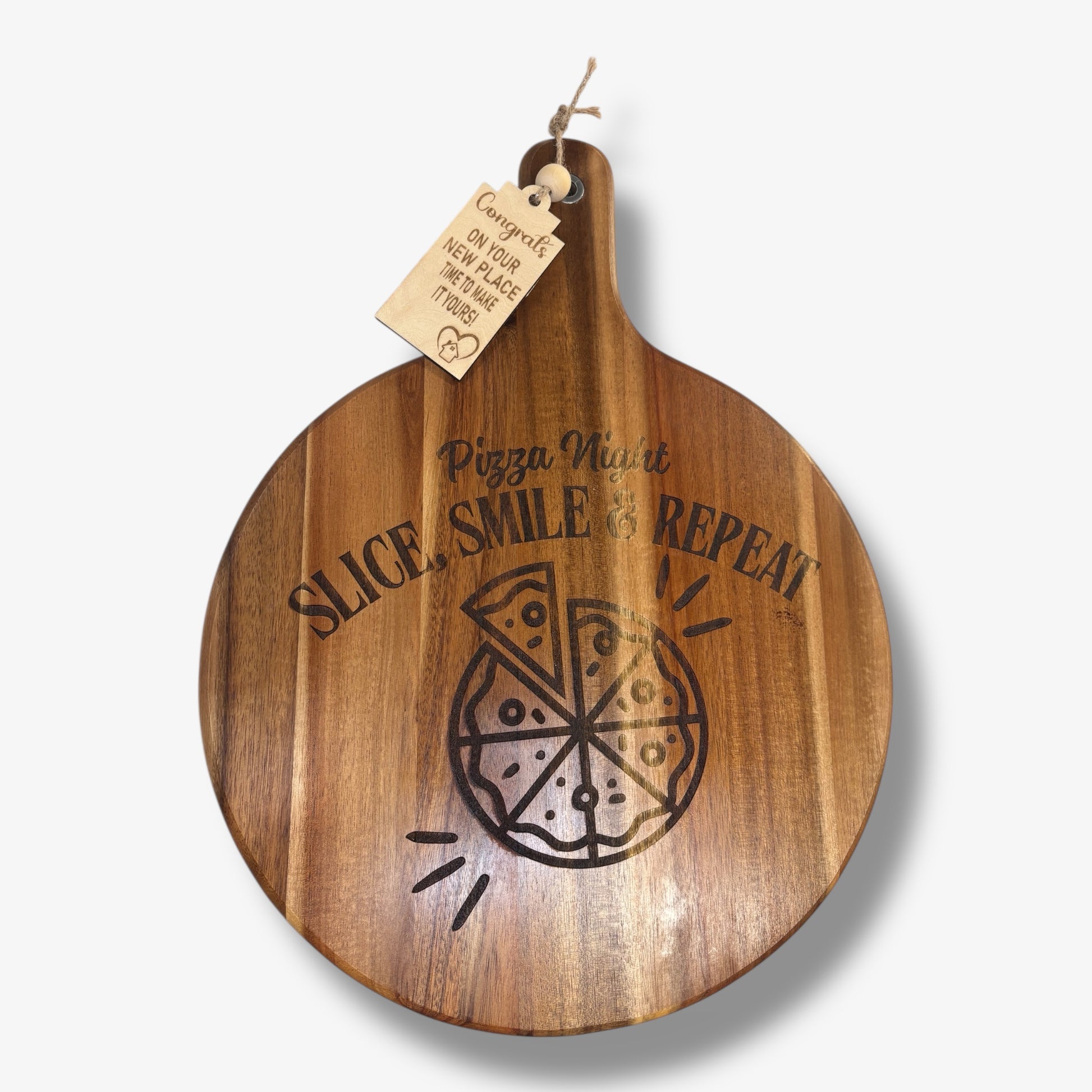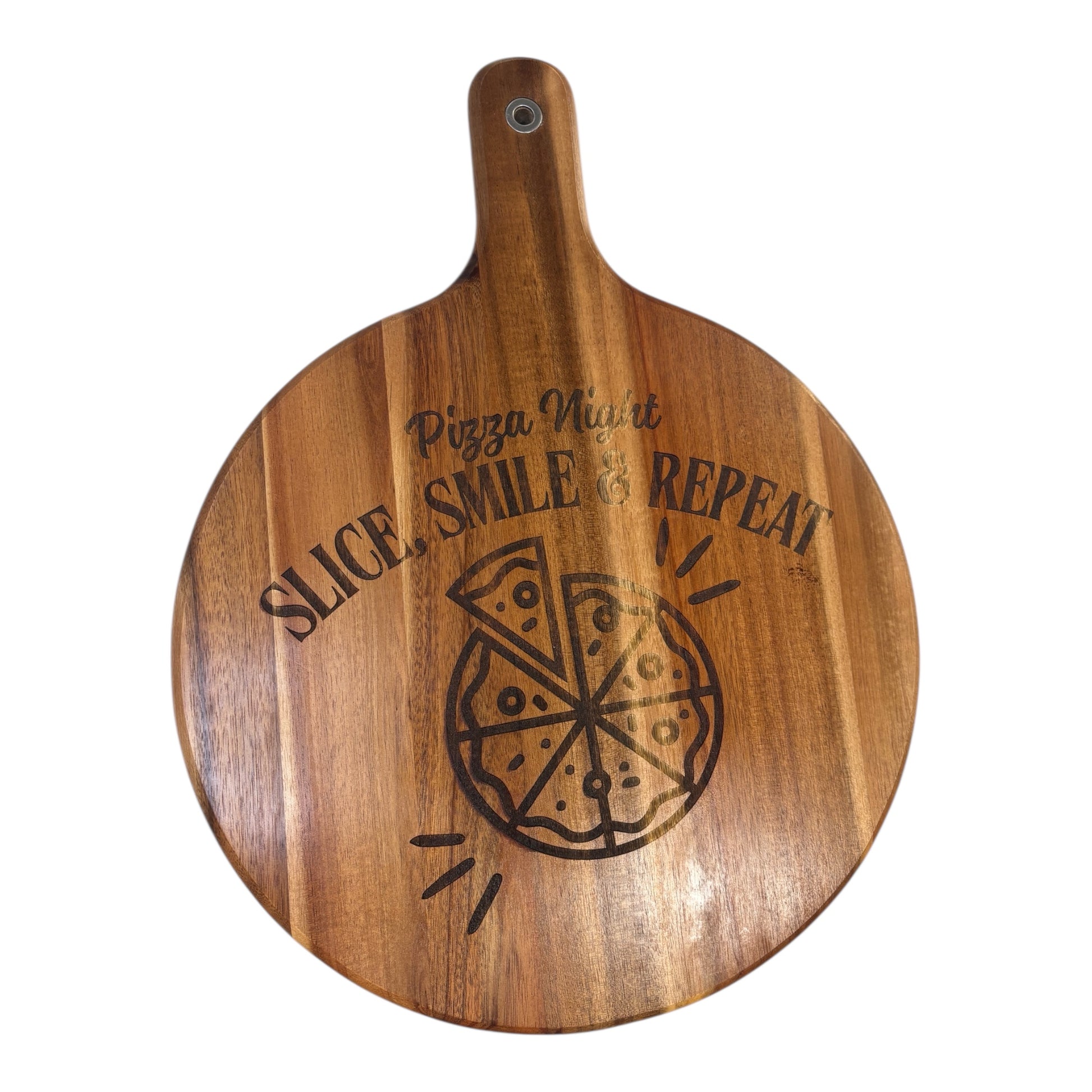 Round Acacia Board (15.7” × 11.8”) – engraved with the phrase “Pizza Night, Slice, Smile & Repeat.” Perfect for pizza night or charcuterie.