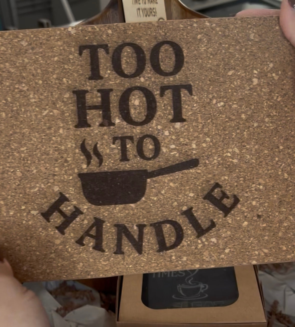 Square Trivet – engraved with the fun phrase “Too Hot to Handle.” Great for protecting surfaces in style.